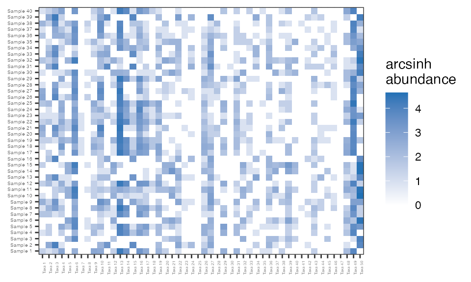 abunHeatmap = function(sim){ reshape2::melt(asinh(sim$sampleTaxaMatrix)) %>% dplyr::rename(sample = Var1, taxa = Var2, asinh.abun = value) %>% ggplot2::ggplot(., aes (x = taxa, y = sample, fill = asinh.abun)) + ggplot2::geom_tile() + ggplot2::theme_bw() + ggplot2::labs(fill = "arcsinh\nabundance") + ggplot2::theme(plot.title = element_text(hjust = 0.5), axis.title.x=element_blank(), axis.title.y=element_blank(), axis.text.x = element_text(size=3, angle=90), axis.text.y = element_text(size=4)) + ggplot2::scale_fill_gradient(low="white", high="#2171b5", na.value = "grey") } abunHeatmap(sim1)