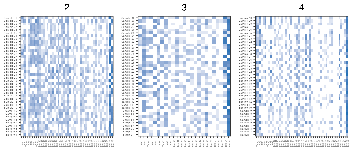 lapply(sim.ls, sparsity) #> [[1]] #> [1] 0.394 #> #> [[2]] #> [1] 0.517 #> #> [[3]] #> [1] 0.639 asinh.abun.hmp = purrr::map2(sim.ls, 2:4, function(x, y) { abunHeatmap(x) + ggplot2::ggtitle(y) + theme(legend.position="none") }) count.hmp.ls = do.call("grid.arrange", c(asinh.abun.hmp, ncol=3))