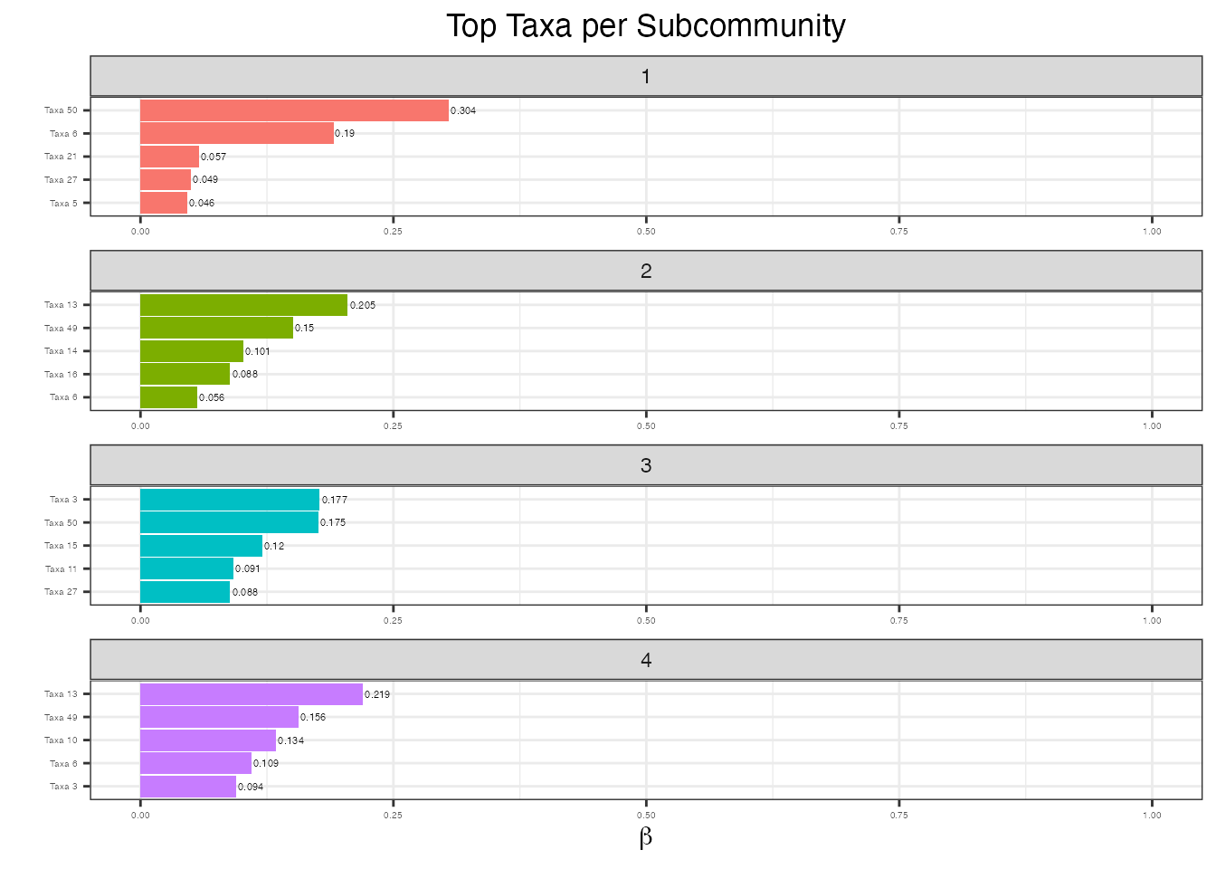Any given subcommunity can be described by its representative taxa, defined as the taxa with the highest probability of belonging to that community. Here the five taxa with the the highest probability, \(\beta_{ij}\), for each of the four subcommunities are plotted.